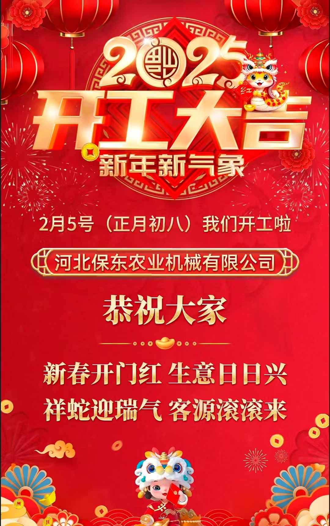 靈蛇騰云開盛景春風浩蕩展宏圖只爭朝夕加油干斗志昂揚創未來正月初八 河北保東開工大吉!在新的一年里河北保東將一如既往為廣大果園、大棚
